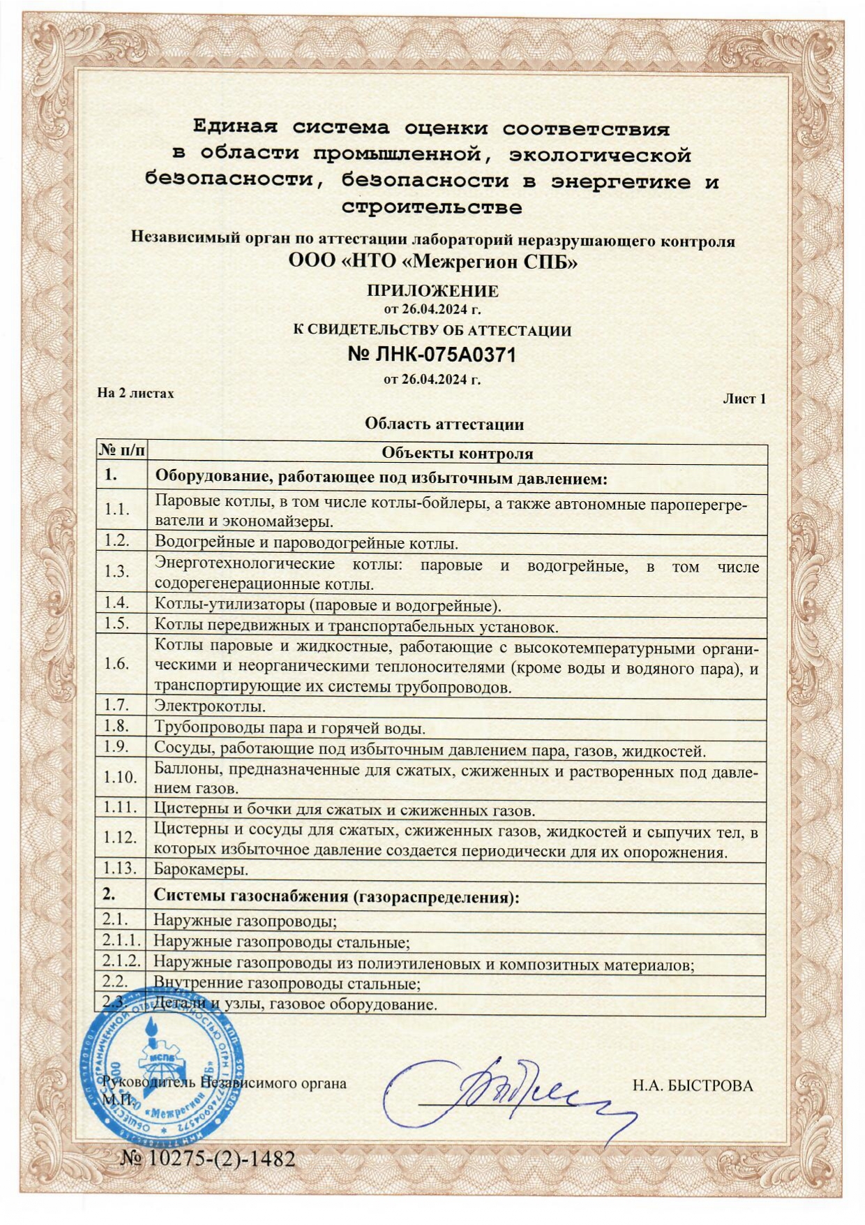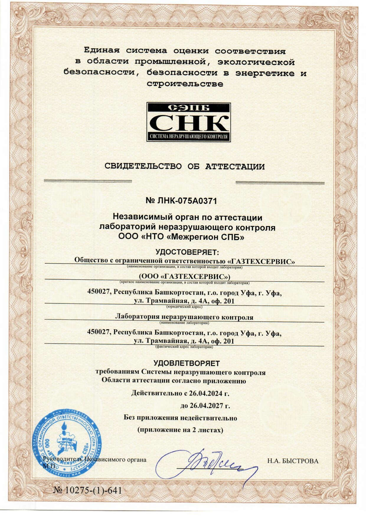 Свидетельство об аттестации № ЛНК-075A0371